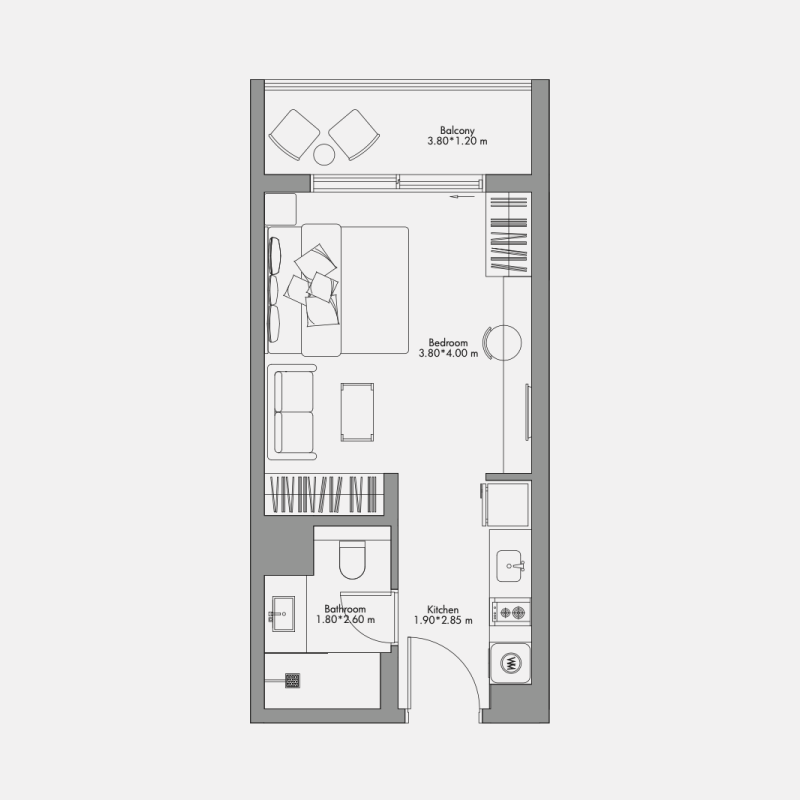 Finished open kitchen design equipped with cooker top, oven, sink, hood, fridge, dishwasher( 1br-3br) and washing machine.